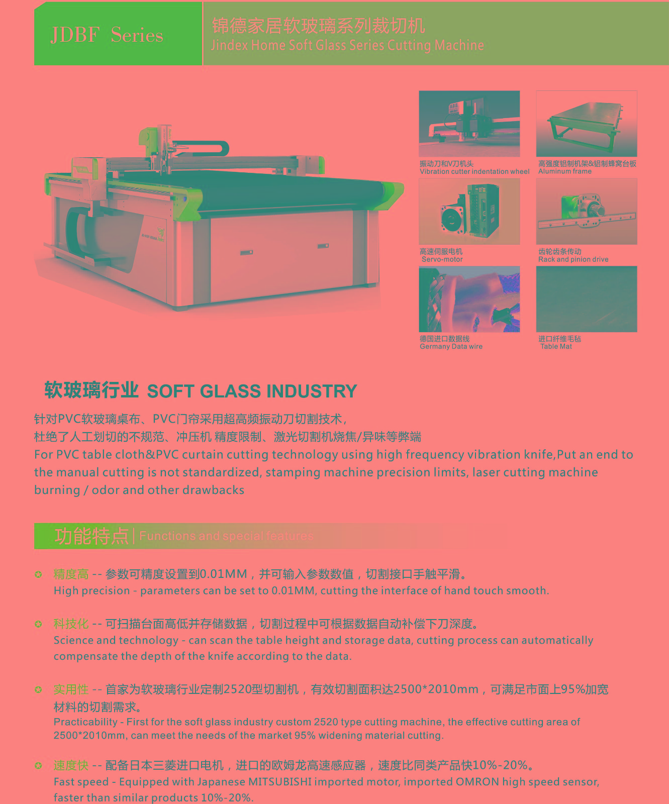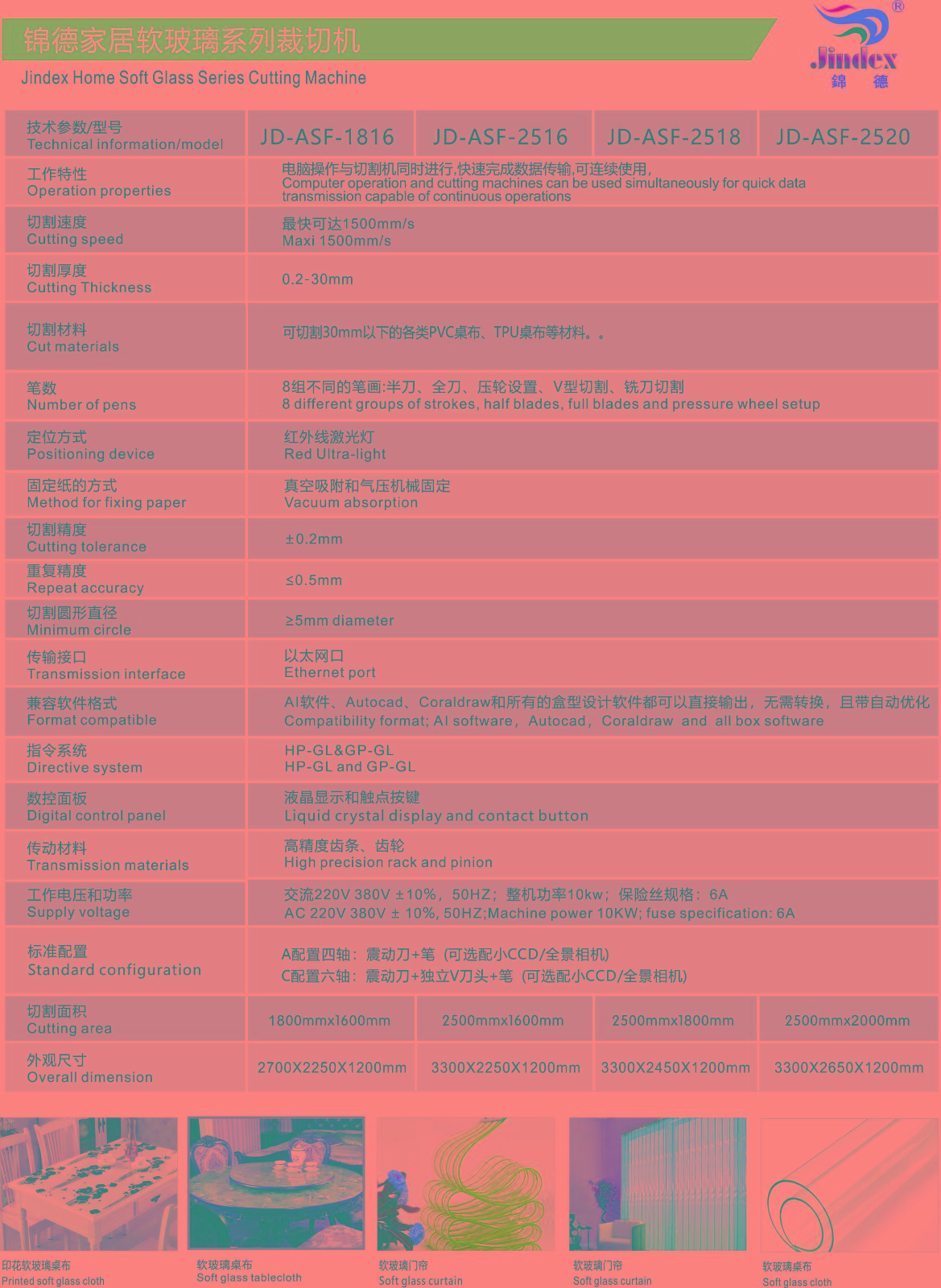 錦德振動(dòng)刀自動(dòng)裁剪機(jī),裁剪效率高,相比人工快5倍左右,相比激光快2倍左右;裁剪精度高,誤差小于0.02mm;高度鎢鋼刀片切割,可以裁剪任意異形材料;智能排版系統(tǒng),節(jié)省材料10%以上;環(huán)保無污染,響應(yīng)國家綠色生產(chǎn)的號(hào)召。 玻璃=pvc軟質(zhì)水晶板在工業(yè)、家庭使用的都很廣泛,pvc軟玻璃的特點(diǎn):耐熱、耐寒、耐光照、抗靜電、抗老化、耐重壓、耐強(qiáng)酸堿、透光性好、使用壽命長(zhǎng)、不變形、不發(fā)碎、不發(fā)硬、高彈性、無毒無味等等!