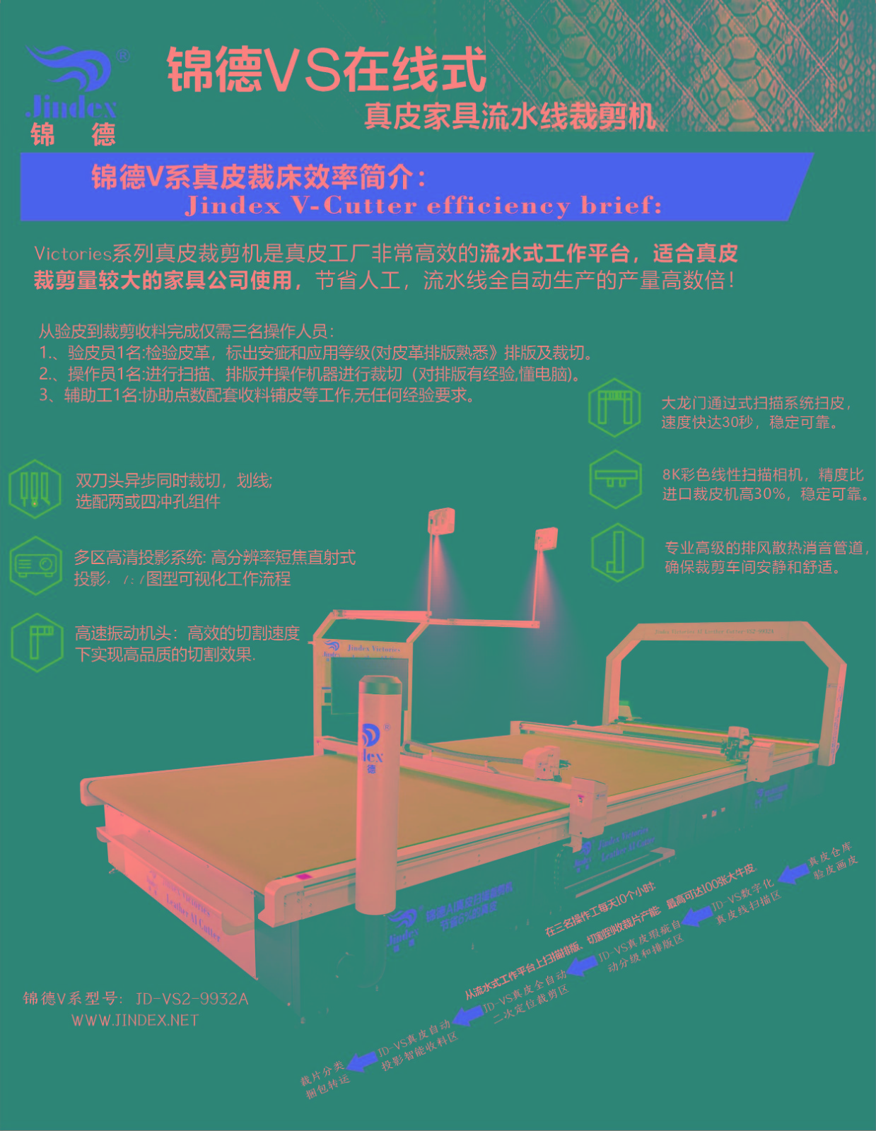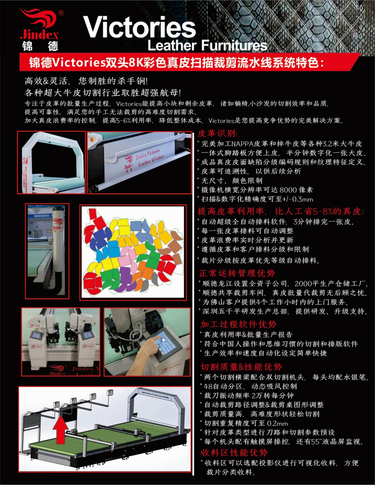 錦德真皮裁剪流水線系統(tǒng)采用先進(jìn)的高清全彩真皮輪廓采集系統(tǒng),通過(guò)高精度掃描提取真皮不規(guī)則輪廓形狀、面積、瑕疵等信息,配合全自動(dòng)排料系統(tǒng),產(chǎn)生優(yōu)化的裁剪方案,獨(dú)特的三段式流水工作平臺(tái),可以發(fā)揮最大裁剪效能,減少勞動(dòng)強(qiáng)度,提升綜合使用能效,裁剪效能較傳統(tǒng)真皮裁剪設(shè)備提升120%以上。